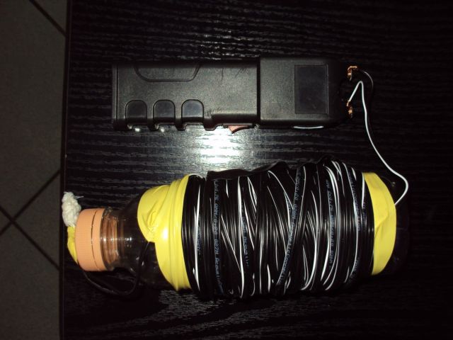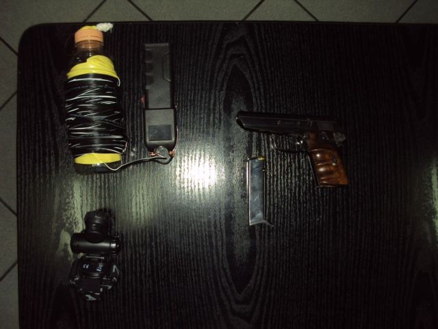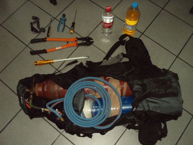 • ένας αυτοσχέδιος εκρηκτικός μηχανισμός (Α.Ε.Μ.), αποτελούμενος από πλαστικό μπουκάλι χωρητικότητας μισού λίτρου, περιέχων μικρή ποσότητα κίτρινου υγρού (προφανώς βενζίνη), στο οποίο ήταν στερεωμένο με μαύρη μονωτική ταινία, καλώδιο και συνδέεται με μαύρο πλαστικό χειριστήριο, τύπου TAZER, με ερυθρό κουμπί και δύο ακροδέκτες.