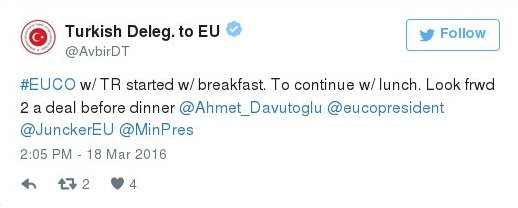 14:36 «Το Ευρωπαϊκό Συμβούλιο με την Τουρκία ξεκίνησε με πρωινό για να συνεχίσει με μεσημεριανό. Ελπίζουμε σε μία συμφωνία πριν το δείπνο», έγραψε στο Twitter η τουρκική αντιπροσωπεία στις Βρυξέλλες.
