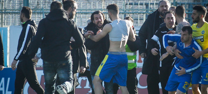 Μέλη των αποστολών ακολούθησαν τους δύο άντρες, με τον Γιώργο Κυριακόπουλο, θέλοντας να υπερασπιστεί τον συμπαίκτη του, να ρίχνει στο έδαφος τον τιμ μάνατζερ του ΠΑΟΚ.