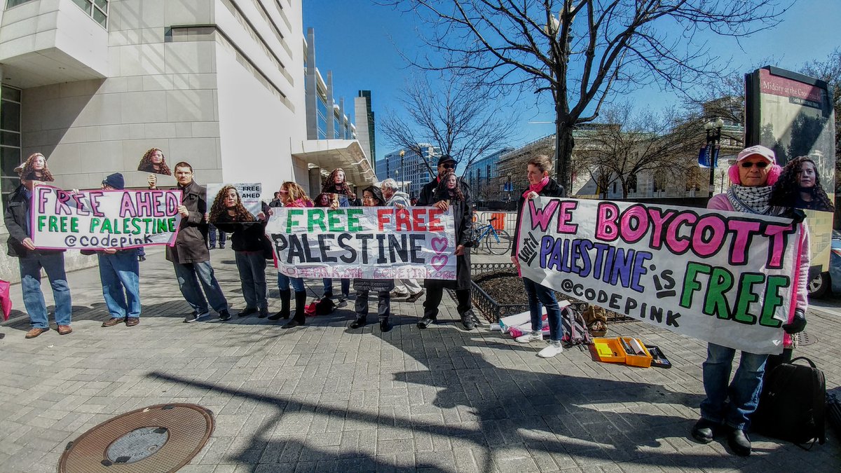 Οι διαδηλωτές υπέρ της Παλαιστίνης συγκεντρώθηκαν εκτός του χώρου της AIPAC κατά τη διάρκεια της διάσκεψης για να διαμαρτυρηθούν για την ισραηλινή κατοχή, καθώς και την απόφαση του Tραμπ να μετακινήσει την Πρεσβεία των ΗΠΑ στο Ισραήλ, στην Ιερουσαλήμ.
