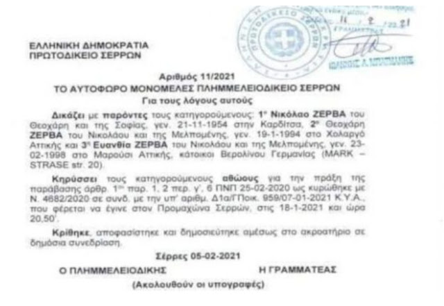 Συντάχθηκε Δικογραφία για απείθεια και παραβίαση των μέτρων για την αποφυγή διασποράς του κοροναϊού και τους έστειλαν στο Δικαστήριο… με Αυτόφωρη Διαδικασία… δόθηκε όμως αναβολή για προετοιμασία και η υπόθεση εκδικάστηκε στις 05/02/21 από το Αυτόφωρο Μονομελές Πλημμελειοδικείο Σερρών.