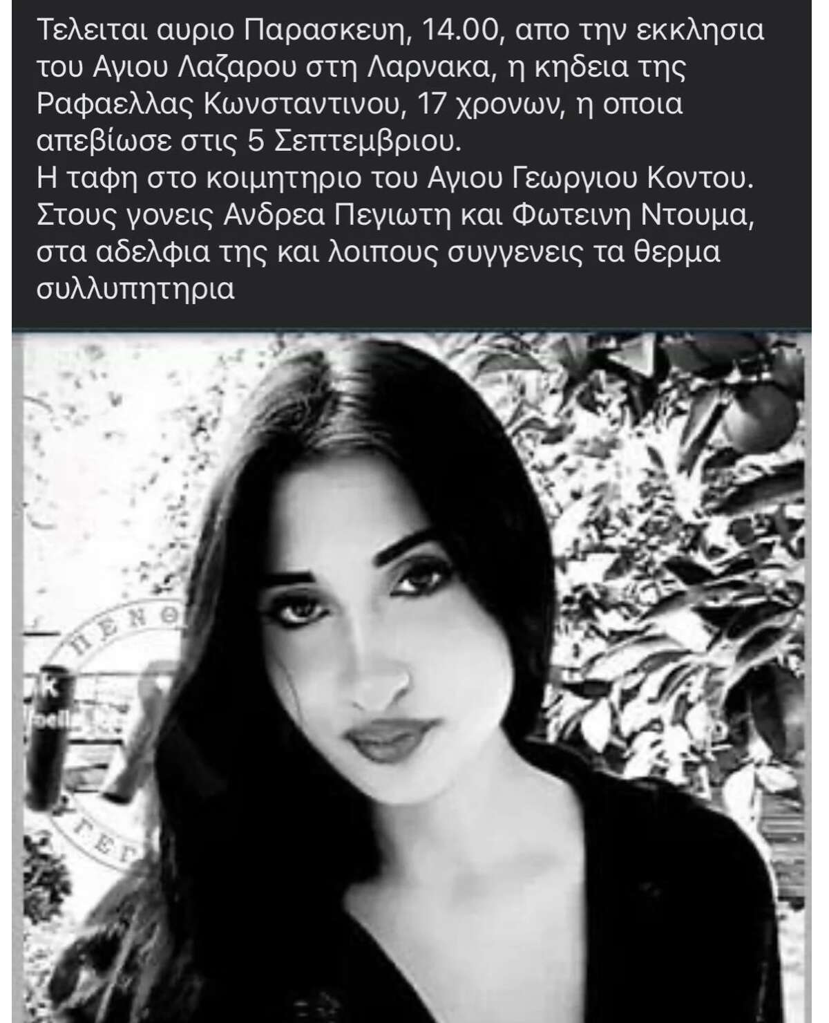 Όλη η Κύπρος και ιδιαίτερα η Λάρνακα έχει βυθιστεί στο πένθος. Μαθεύτηκε η είδηση θανάτου της 17χρονης Ραφαέλλας Κωνσταντίνου η οποία «έφυγε» στις 5 Σεπτεμβρίου και όλοι είναι σοκαρισμένοι.