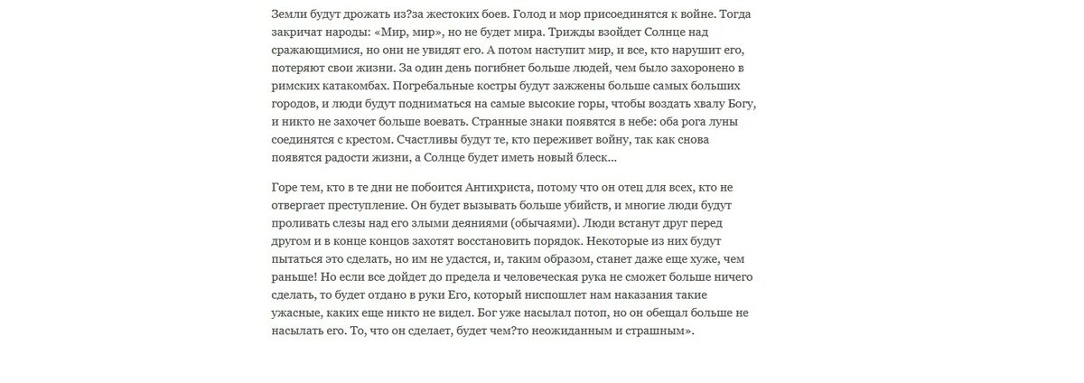 Θα υπάρξουν περισσότερες δολοφονίες λόγω του Αντίχριστου, πολλοί άνθρωποι θα ρίξουν δάκρυα για τις κακές του πράξεις μέχρι να θελήσουν να αποκαταστήσουν την τάξη. Αλλά όλες οι προσπάθειες να γίνει αυτό θα αποτύχουν, όλα θα γίνουν χειρότερα από ό,τι ήταν. Τα ανθρώπινα χέρια θα είναι ανίσχυρα, αλλά ο Θεός θα στείλει τρομερές τιμωρίες. Ήδη έστειλε πλημμύρα και υποσχέθηκε να μην το επαναλάβει. Αυτό που θα κάνει θα είναι τρομακτικό και απροσδόκητο.