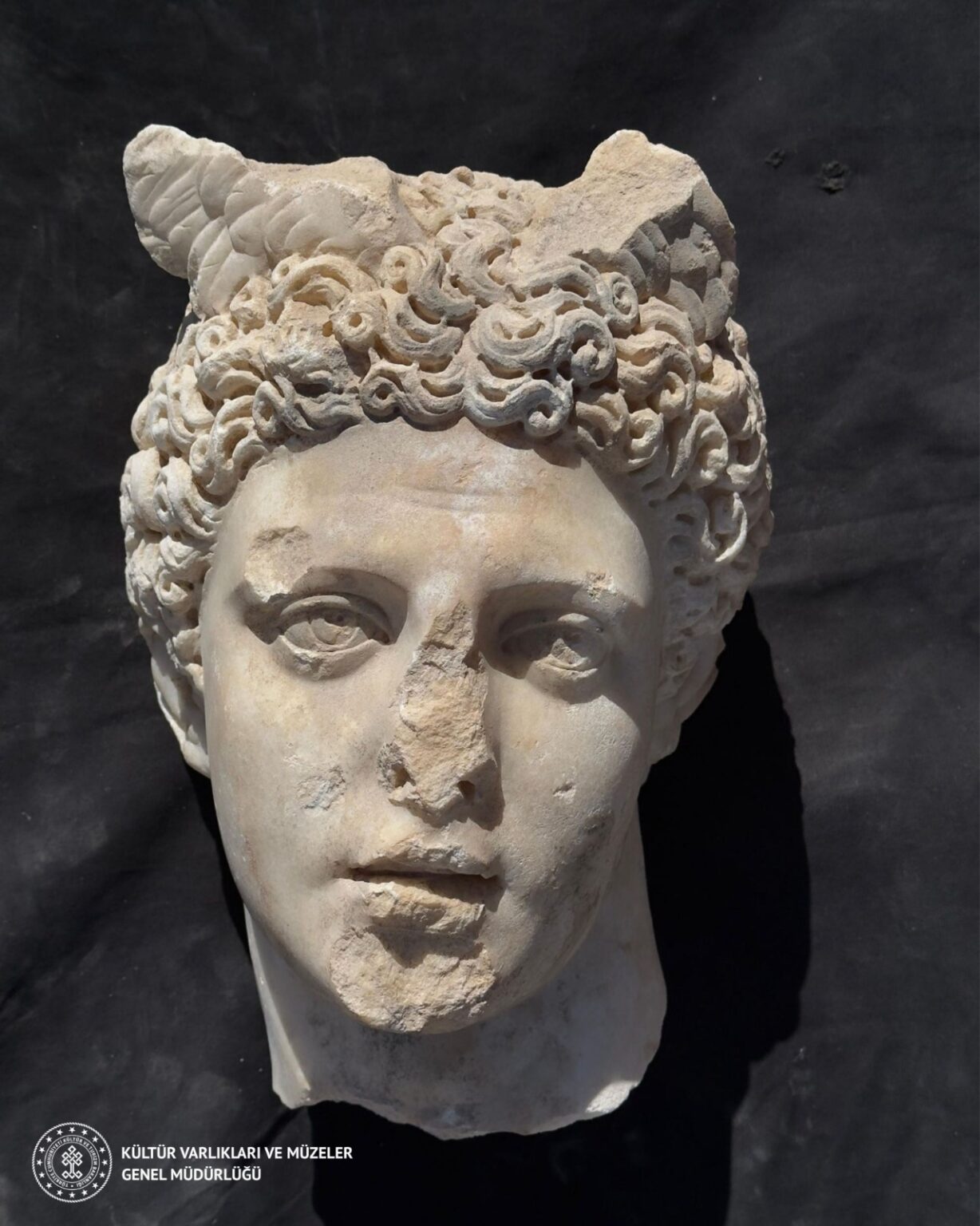Η πρόσφατα αποκαλυφθείσα κεφαλή γλυπτού βρέθηκε στον ανατολικό διάδρομο εισόδου του Βουλευτηρίου και είναι σκαλισμένη από υψηλής ποιότητας λευκό μάρμαρο Δοκιμείου (Ισκεχισάρ), ένα υλικό που εκτιμήθηκε στην αρχαιότητα για την καθαρότητα και την αντοχή του. Η προκαταρκτική ανάλυση χρονολογεί το έργο στα μέσα του 2ου αιώνα μ.Χ. Τα λεπτεπίλεπτα χαρακτηριστικά του προσώπου, τα προσεκτικά αποτυπωμένα μάτια και οι ίριδες, και οι κομψά σγουρές μπούκλες -με το εμβληματικό μοτίβο των φτερών- αντανακλούν την στυλιστική κληρονομιά του διάσημου κλασικού γλύπτη Πραξιτέλη. Οι ειδικοί αναγνωρίζουν στο έργο αυτό ένα εξαιρετικό δείγμα του “Ερμή της Άνδρου” – ενός στυλ γλυπτικής που ήταν διάσημο σε όλο τον αρχαίο κόσμο για την αρμονία, τη φυσικότητα και την κομψή του εμφάνιση.