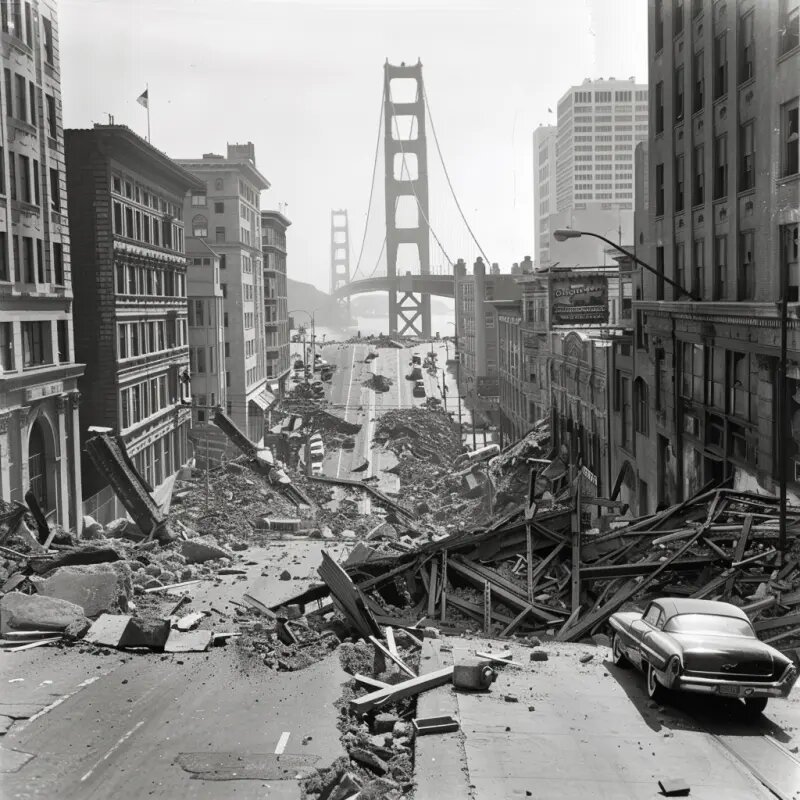 Στις 18 Απριλίου 1906, τα δύο μισά της Καλιφόρνια, που τα χωρίζει το ρήγμα του San Andreas, ξαφνικά, σε μόλις ένα δευτερόλεπτο, μετακινήθηκαν μεταξύ τους... κατά 7 μέτρα! Το Σαν Φρανσίσκο μετατράπηκε αμέσως σε τίποτα άλλο από ερείπια. 3.000 πέθαναν, 300.000 έμειναν άστεγοι. Η ισχύς του σεισμού ήταν πάνω από 8 βαθμούς σε κλίμακα 9 βαθμών.