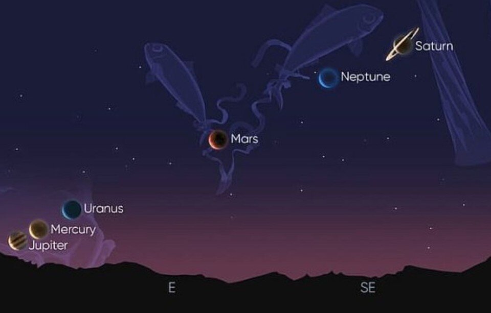 Οι συμμετέχοντες στην «παρέλαση» άρχισαν να παίρνουν τις θέσεις τους στον νυχτερινό ουρανό στα ανατολικά και νοτιοανατολικά. Μερικά φαίνονται λίγες ώρες πριν το ξημέρωμα. Για να δείτε τον Ουρανό και τον Ποσειδώνα, θα χρειαστείτε ένα μικρό τηλεσκόπιο ή ισχυρά κιάλια.