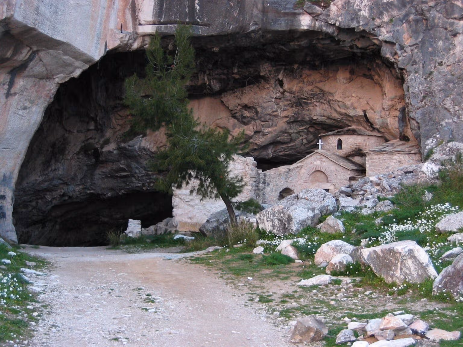 Η είσοδός της σπηλιάς είναι εντυπωσιακή. Στα δεξιά της βρίσκεται η εκκλησία του Αγίου Νικολάου με τοιχογραφίες πρωτότυπης τεχνογραφίας (13ος αι.) Στη νότια πλευρά του είναι χαραγμένες μορφές αγγέλων, σταυροί, αετοί και διάφορα χριστιανικά σύμβολα. Στην άλλη πλευρά του σπηλαίου βρίσκεται το ασκητήριο του Αγίου Σπυρίδωνα με μεταβυζαντινά έργα. Στο δάπεδό του όπως φαίνεται και στο video υπάρχουν δύο μικρές κρύπτες καθώς και μια ταφική λάρνακα. Οι τοιχογραφίες από τα δύο αυτά εκκλησάκια εκτίθενται σήμερα στο Βυζαντινό και Χριστιανικό Μουσείο της Αθήνας.