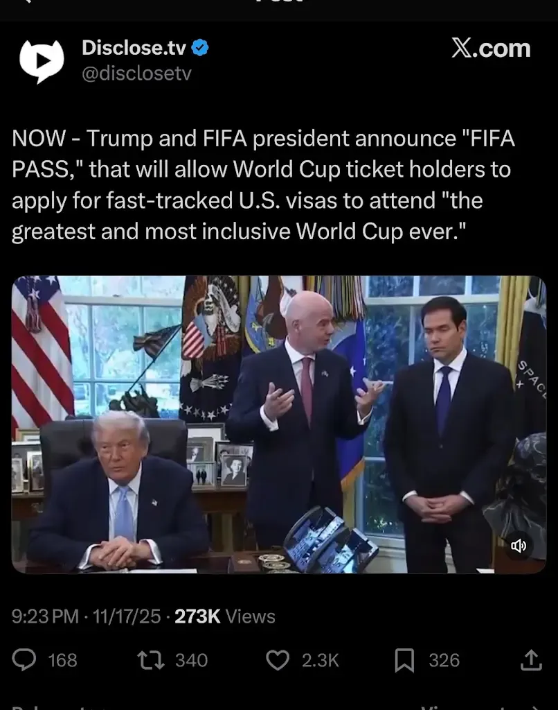 Αλλά μην ανησυχείτε, επειδή ο Τραμπ είπε ότι το Παγκόσμιο Κύπελλο της FIFA του χρόνου θα είναι «χωρίς αποκλεισμούς», ενώ παράλληλα θα επιτρέπει την ταχεία έκδοση βίζας για την είσοδο στις ΗΠΑ (και την μη έξοδο από αυτές). Νίκη!