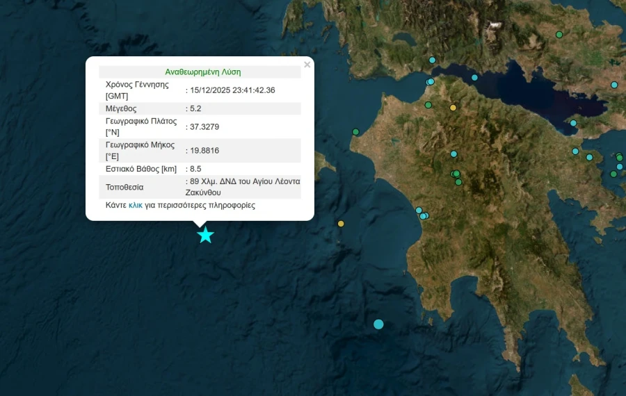«ΣΗΜΕΡΑ 16/12/2025 03:41, IΣXYPH,M=5.2,EΠIK:345 XΛM. Δ AΘHNAΣ, 89 XΛM. ΔNΔ TOY AΓIOY ΛEONTA ZAKYNΘOY.