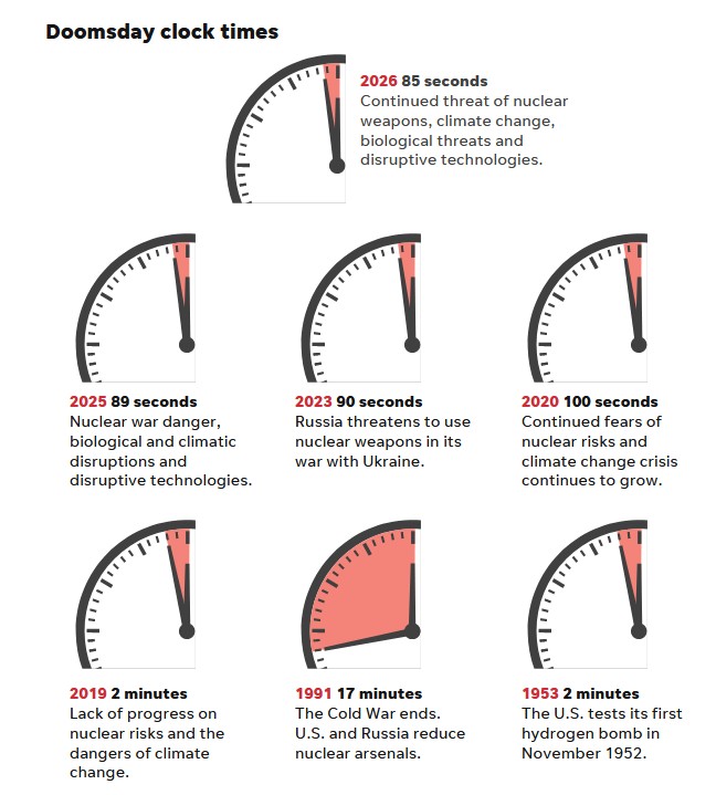 Σύμφωνα με την επαναφορά του δυσοίωνου αλλά συμβολικού Ρολογιού της Ημέρας της Κρίσης, η ανθρωπότητα βρίσκεται στο πιο κοντινό σημείο της αυτοκαταστροφής σε ολόκληρη την ιστορία της. Το μεταφορικό ρολόι δείχνει τώρα 85 δευτερόλεπτα πριν από τα μεσάνυχτα, τέσσερα δευτερόλεπτα μπροστά από την επαναφορά του περασμένου έτους.