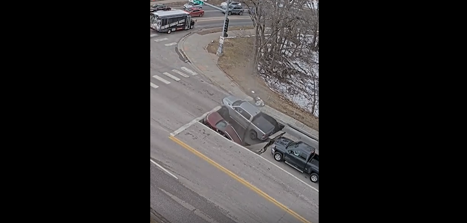 Κάμερες ασφαλείας στο Πανεπιστήμιο της Νεμπράσκα-Ομάχα κατέγραψαν τη στιγμή που δύο οχήματα έπεσαν κατευθείαν σε μια καταβόθρα.