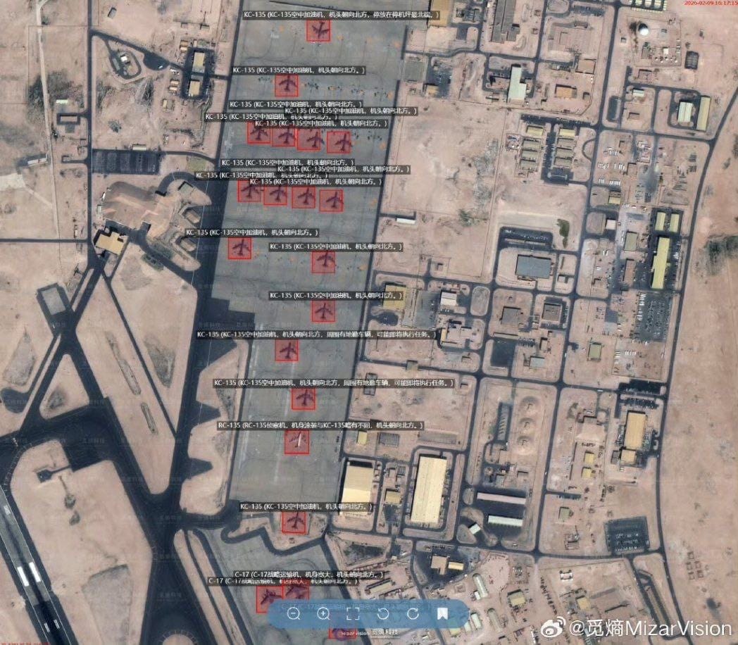 Το ρωσικό κανάλι Telegram Intel Slava αναφέρει ότι, τουλάχιστον, 16 αεροσκάφη KC-135 Rivet Joint Reconnaissance της Πολεμικής Αεροπορίας των ΗΠΑ εντοπίστηκαν από κινεζικό δορυφόρο στην αεροπορική βάση Al Udeid στο Κατάρ.
