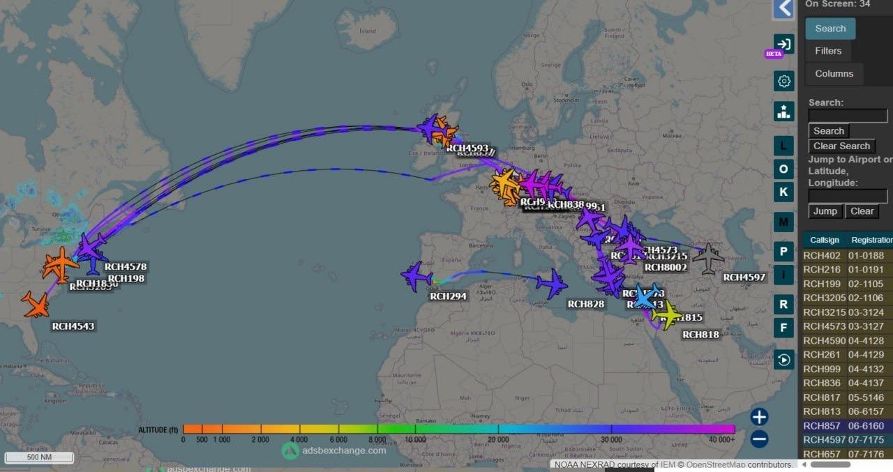 Αναφέρεται επίσης σε διάφορα κανάλια του Telegram που παρακολουθούν στρατιωτικούς ελιγμούς ότι η Πολεμική Αεροπορία των ΗΠΑ έχει αρχίσει να πετάει βαριά αεροσκάφη προς την Ευρώπη και τη Μέση Ανατολή, ικανά να φιλοξενήσουν μεγάλο αριθμό στρατευμάτων του Αμερικανικού Στρατού.