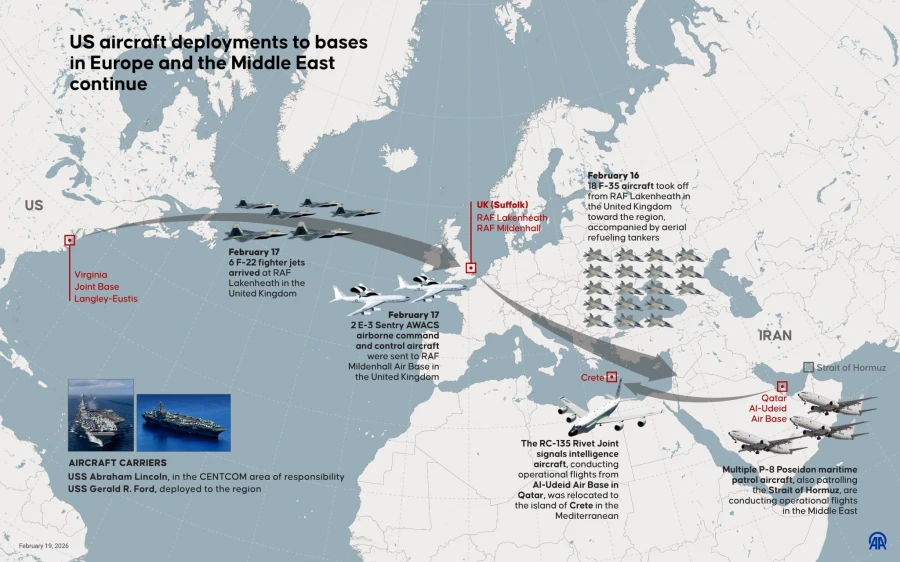 Σύμφωνα με παρατηρητές, τρία από τα στρατηγικά αεροσκάφη βαρέως τύπου C-5M «Super Galaxy» της Πολεμικής Αεροπορίας των ΗΠΑ βρίσκονται αυτή τη στιγμή ταυτόχρονα στον αέρα, πετώντας από την Ευρώπη προς τη Μέση Ανατολή, ενώ ένα τέταρτο αεροσκάφος ετοιμάζεται να διασχίσει τον Ατλαντικό.