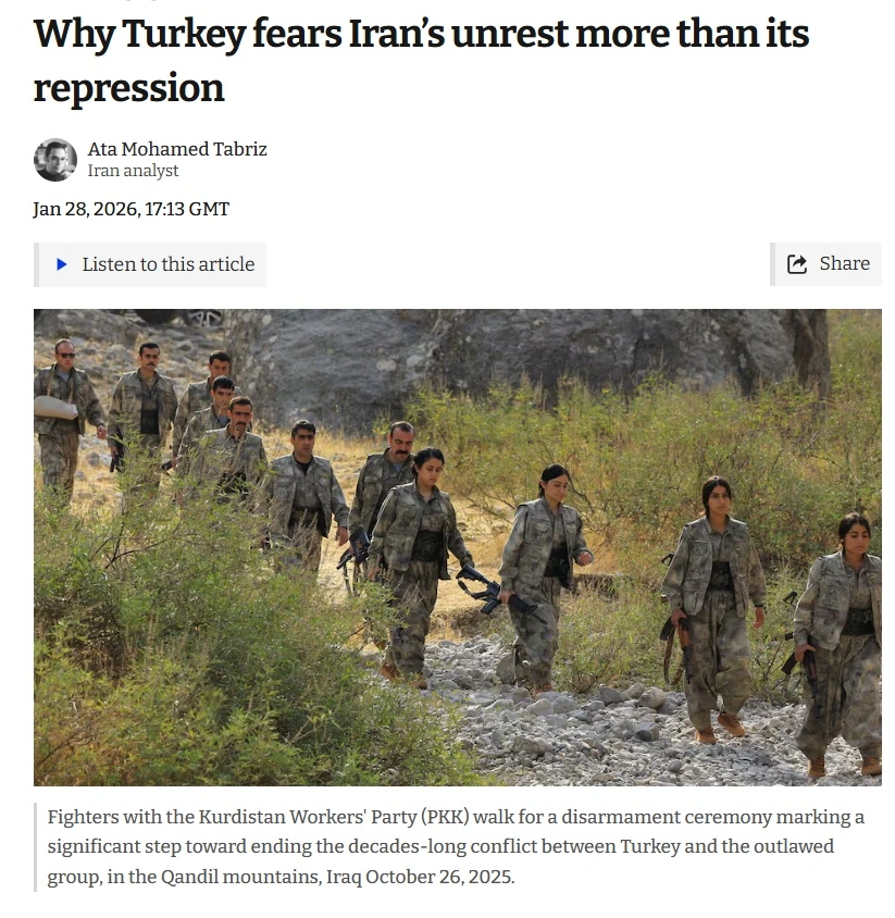 Ως εκ τούτου, η Άγκυρα βρίσκεται σε μια εξαιρετικά δύσκολη θέση. Από τη μία πλευρά, ο Ταγίπ Ερντογάν προσπαθεί να διατηρήσει την εύθραυστη ειρηνευτική διαδικασία με τους Κούρδους που ξεκίνησε το 2024, και από την άλλη, βλέπει τον τ Ντόναλντ Τραμπ, να είναι έτοιμος να ενισχύσει τις κουρδικές δυνάμεις που η Τουρκία θεωρεί τρομοκρατικές απειλές. Η ανησυχία της Τουρκίας είναι ότι η αλλαγή καθεστώτος στο Ιράν μπορεί να οδηγήσει σε έναν «κουρδικό διάδρομο» που θα εκτείνεται από τη Συρία έως το Ιράν, απομονώνοντας γεωπολιτικά την Άγκυρα.
