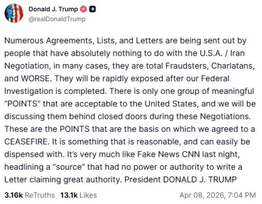 Ο ίδιος ο Τραμπ πήρε θέση με μια οργισμένη ανάρτηση στο Truth Social, στρεφόμενος κατά όσων διακινούν «έγγραφα» που δεν ανταποκρίνονται στην πραγματικότητα. «Πολλές συμφωνίες, κατάλογοι και επιστολές αποστέλλονται από άτομα που δεν έχουν απολύτως καμία σχέση με τις διαπραγματεύσεις ΗΠΑ – Ιράν – σε πολλές περιπτώσεις, πρόκειται για απόλυτους απατεώνες, τσαρλατάνους και ακόμα χειρότερους», τόνισε μεταξύ άλλων.