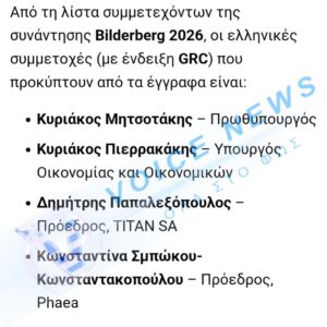 Με την ευκαιρία της 72ης συνάντησης της λέσχης Bilderberg λοιπόν που θα γίνει 10 – 12 Απριλίου 2026 στην Washington DC, τα άτομα που συμμετέχουν και αποφασίζουν πόσο πιο δύσκολη θα κάνουν την ζωή μας και πως θα μειώσουν τον παγκόσμιο πληθυσμό γιατί είμαστε πολλοί και τους είμαστε άχρηστοι, μαζίφυσικά με το Παγκόσμιο Οικονομικό Φόρουμ.